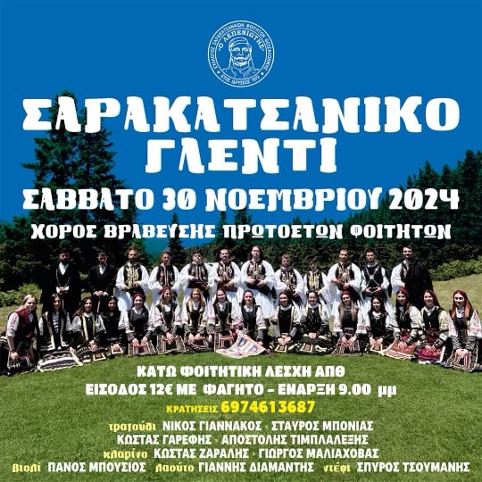 Ο Σύλλογος Σαρακατσαναίων Φοιτητών Θεσσαλονίκης «ο Λεπενιώτης» σας προσκαλεί με μεγάλη χαρά στο Χορό Βράβευσης Πρωτοετών Φοιτητών για το 2024, που θα λάβει χώρα το Σάββατο 30 Νοεμβρίου και ώρα 21:00 στην Κάτω Φοιτητική Λέσχη του Α.Π.Θ.